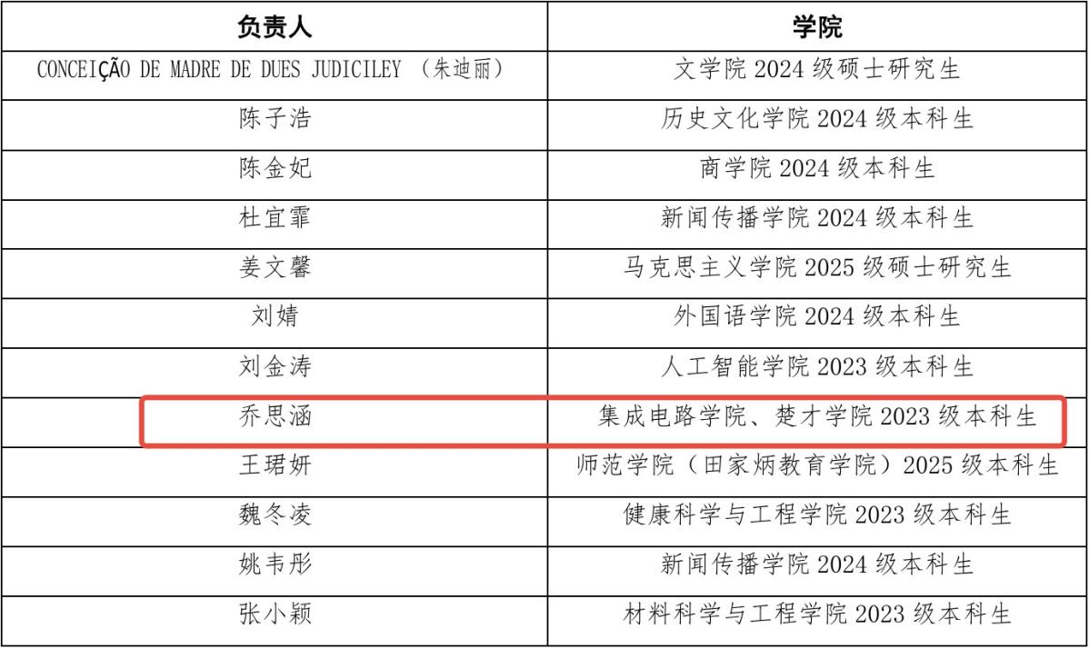 近日,湖北大学第二届提案征集大赛结果正式揭晓,我院2023级本科生乔思涵同学凭借《关于构建科创竞赛朋辈赋能体系,服务创新性大学建设的提案》荣获三等奖。该提案紧密贴合校园实际需求,调研扎实深入、对策具体可行,于细节之处尽显湖大学子的务实担当。基于此次赛事中的出色表现,乔思涵同学同时受聘为湖北大学第四届“学生校务助理”。