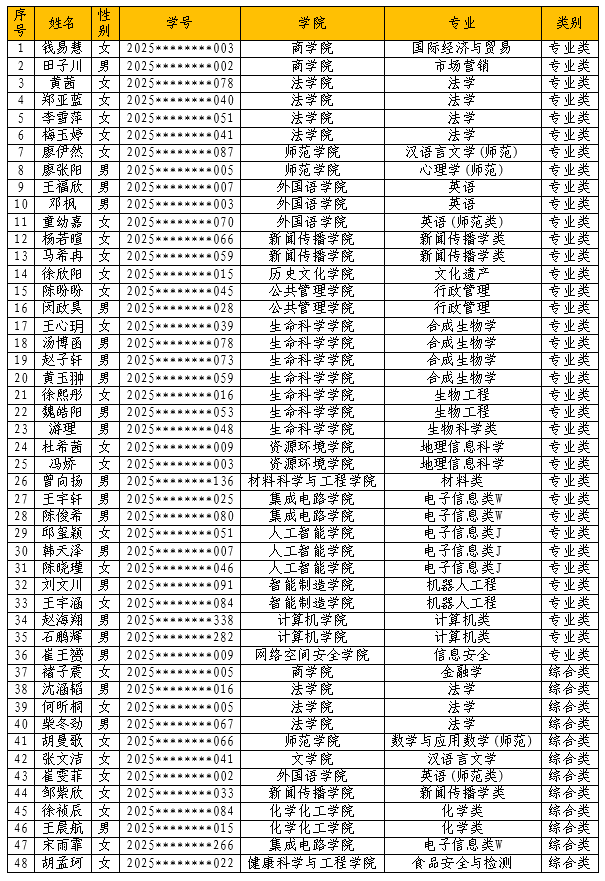 根据2025级“楚才计划”学生选拔工作安排,楚才学院于2025年12月组织了报名、笔试、面试工作,经综合考核,拟定商学院钱易慧等48名同学入选2025级“楚才计划”。现予公示,名单如下: