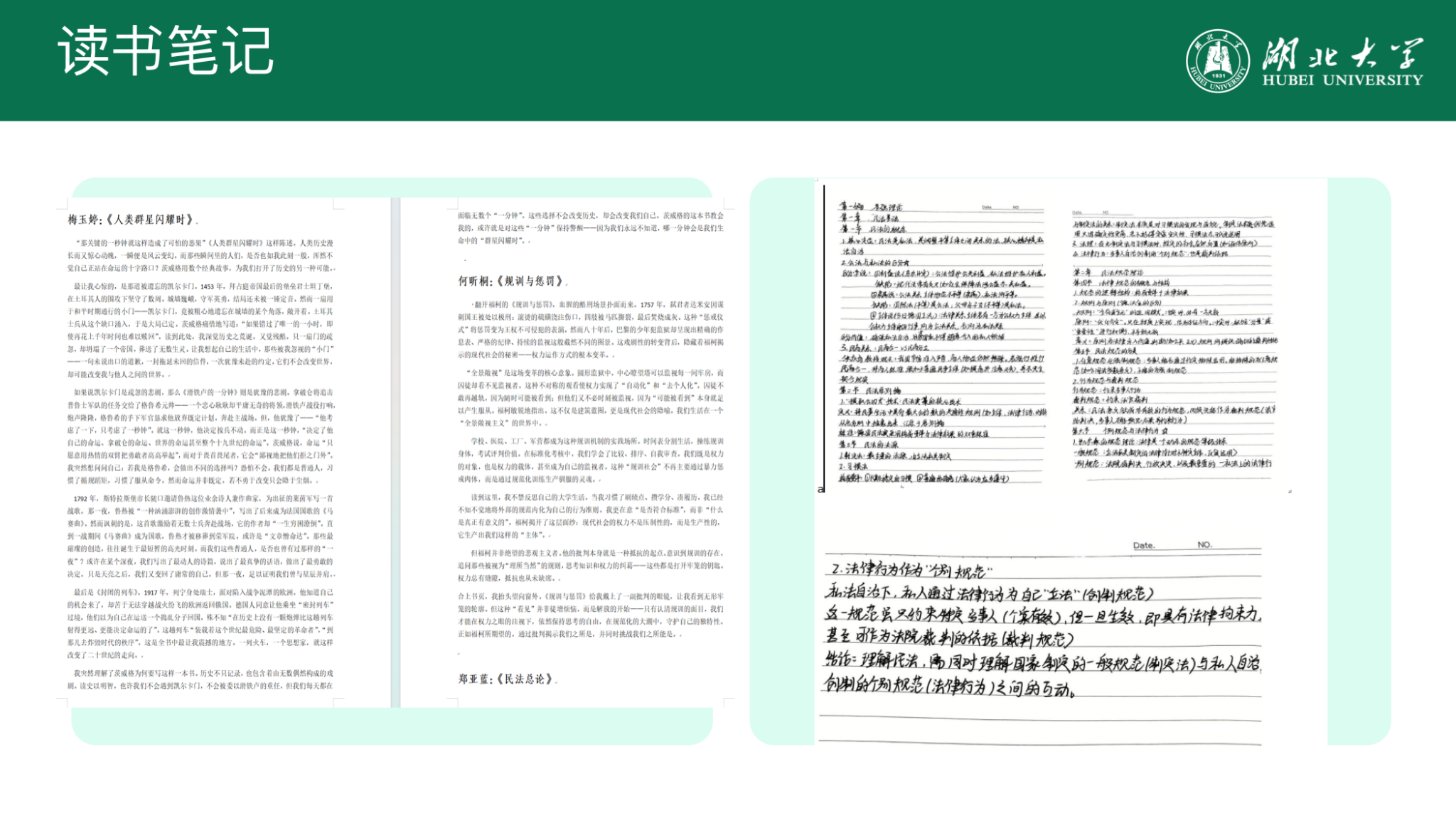 三位同学在阅读中各有收获,从经典著作里汲取精神养分,为基层实践筑牢思想底色,也让思考有了更专业的视角。何昕桐研读福柯的《规训与惩罚》,剖析西方权力运作模式的转型,读懂现代社会中无处不在的“微观权力”,学会在规范中保持清醒的审视与思考;郑亚蓝细读朱庆育的《民法总论》,领悟民法并非法条堆砌,而是兼具逻辑之美与人性温度的精密思维体系,深化了对私法自治的理解;梅玉婷品读茨威格的《人类群星闪耀时》,从历史的偶然与戏剧性中警醒,明白平凡时刻的微小选择终将塑造人生,更读懂思想与坚守的力量。